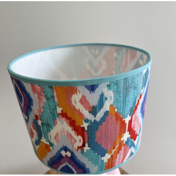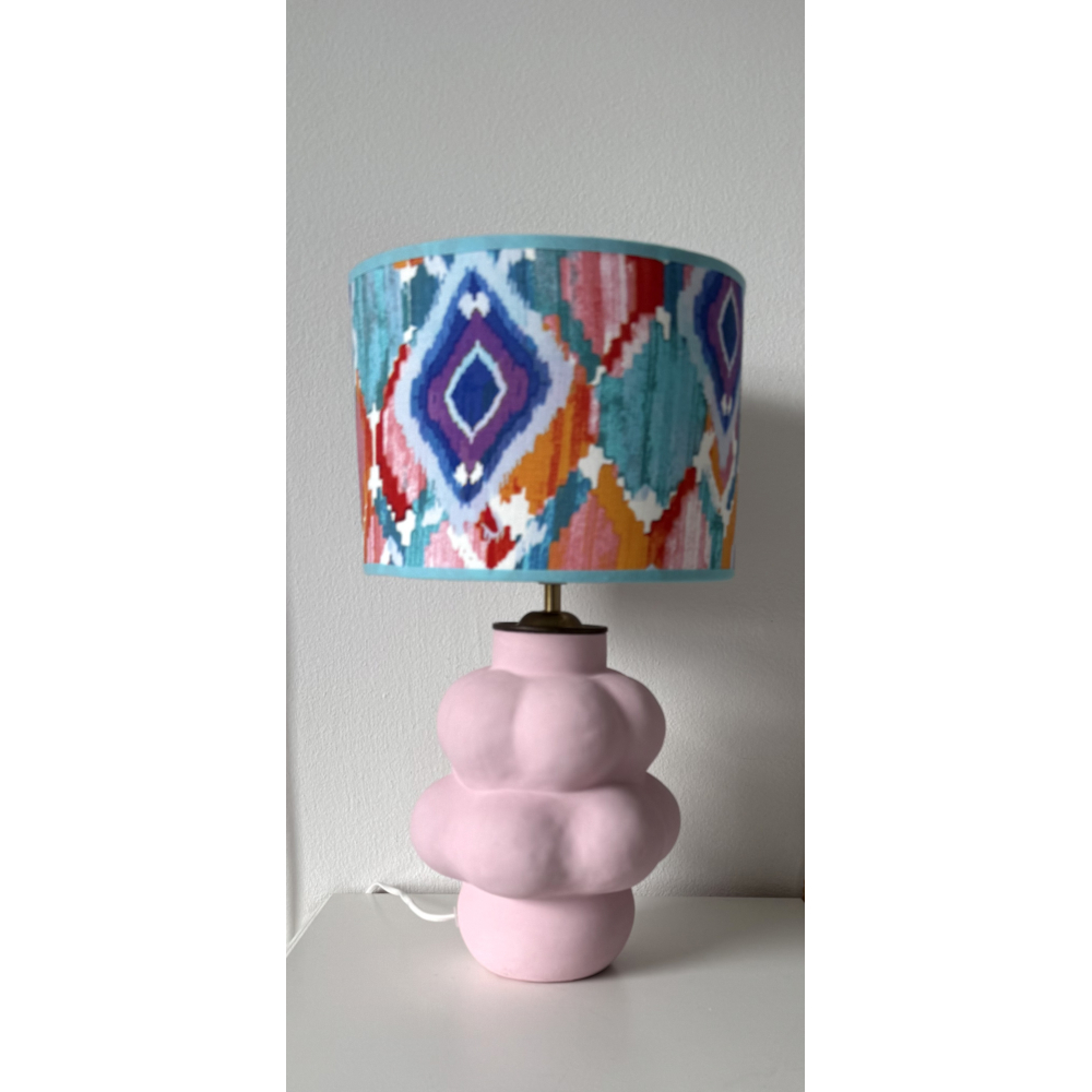 De lampenkap met een diameter van 25 cm is handgemaakt met een vrolijke stof.
