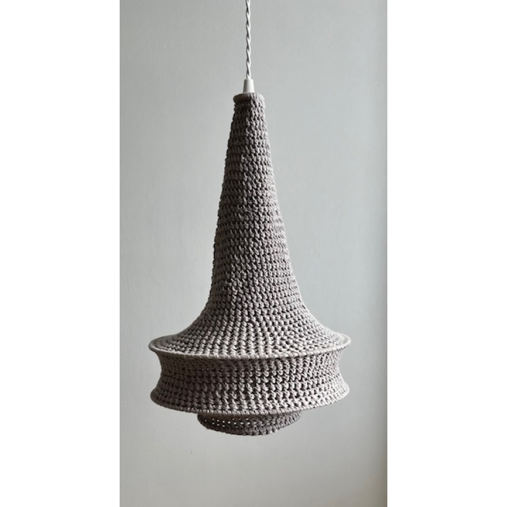 Hanglamp handgehaakt met gemerceriseerde katoen in de kleur taupe/grijs.