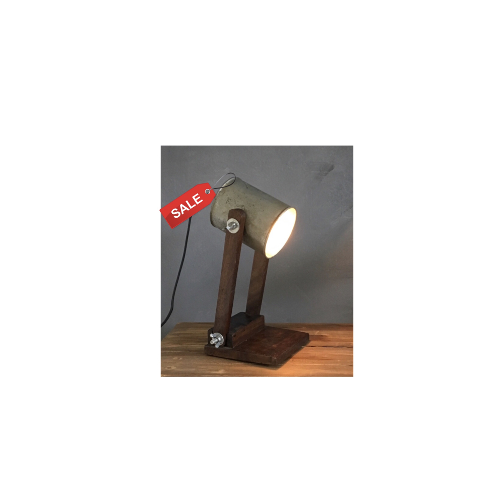 Stoer tafellampje met metalen kapje met zwart snoer met schakelaartje.