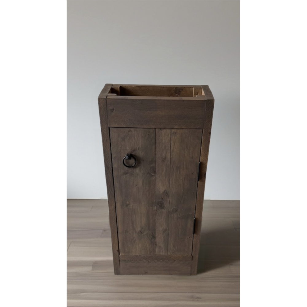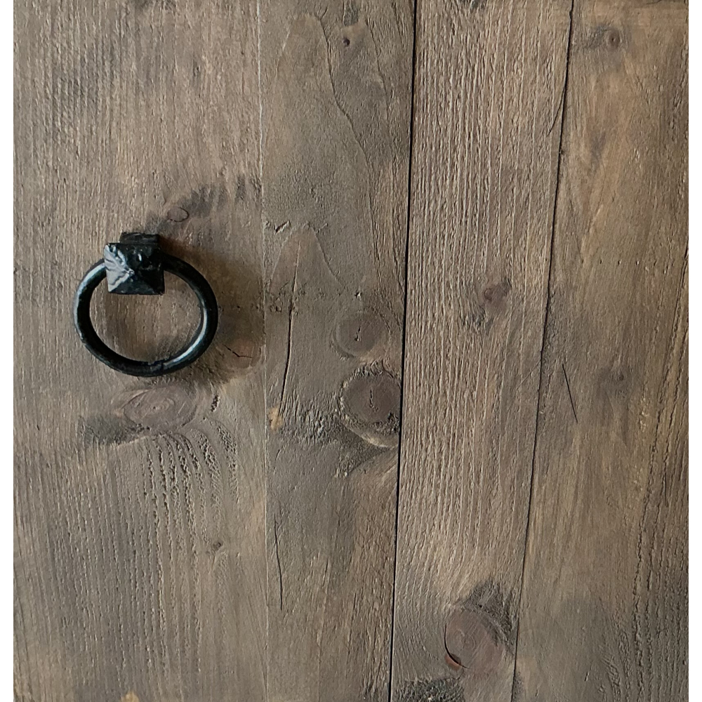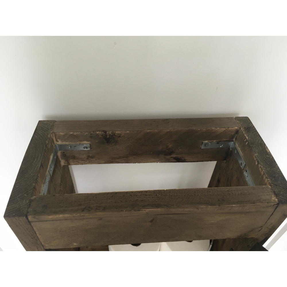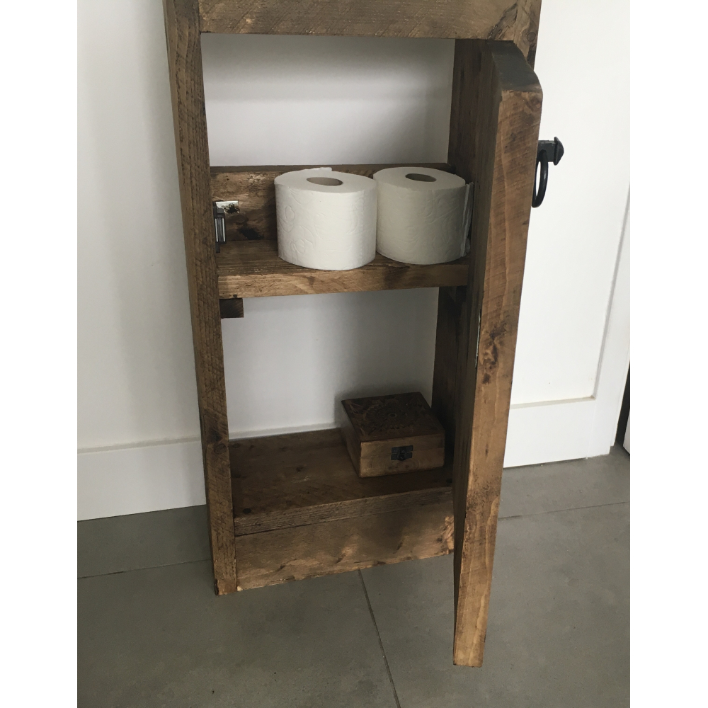 Industrieel staand toiletkastje gemaakt van oud steigerhout, bewerkt met een loogbeits en afgewerkt met een pantserlak mat in de kleur vergrijsd noten.