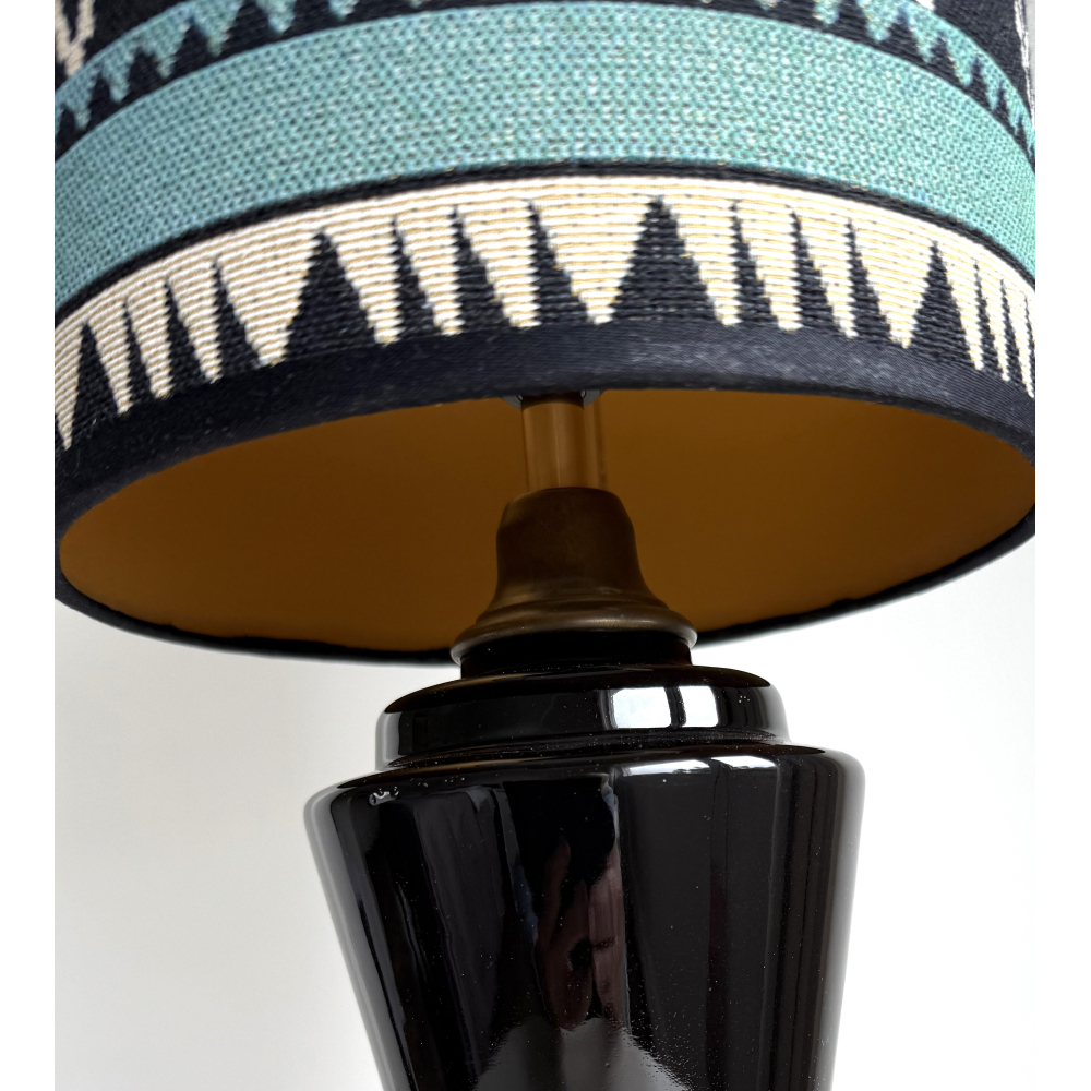 Deze zwarte keramieken tafellamp heeft een goudkleurige fitting en snoer met schakelaartje.
