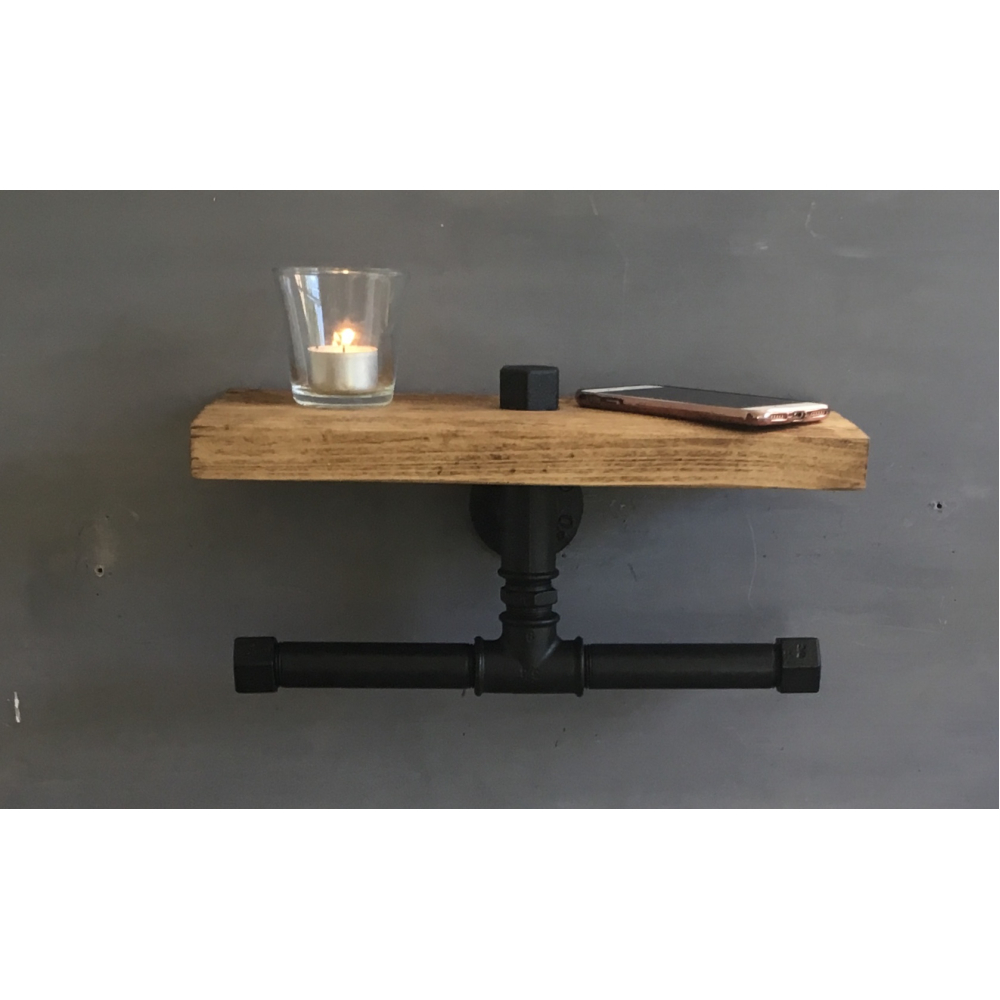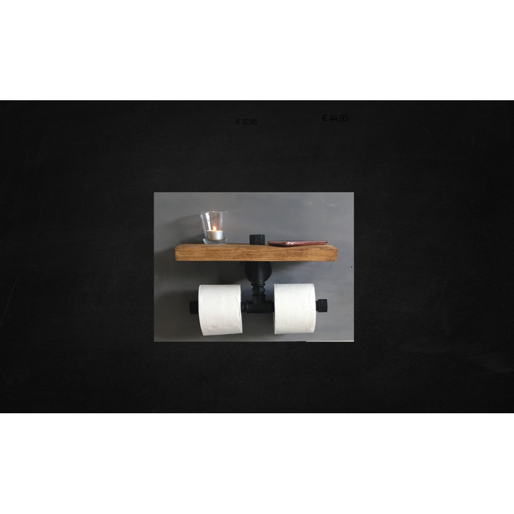 De toiletrolhouder heeft een bewerkt steigerhouten plankje van 35,5 cm breed.