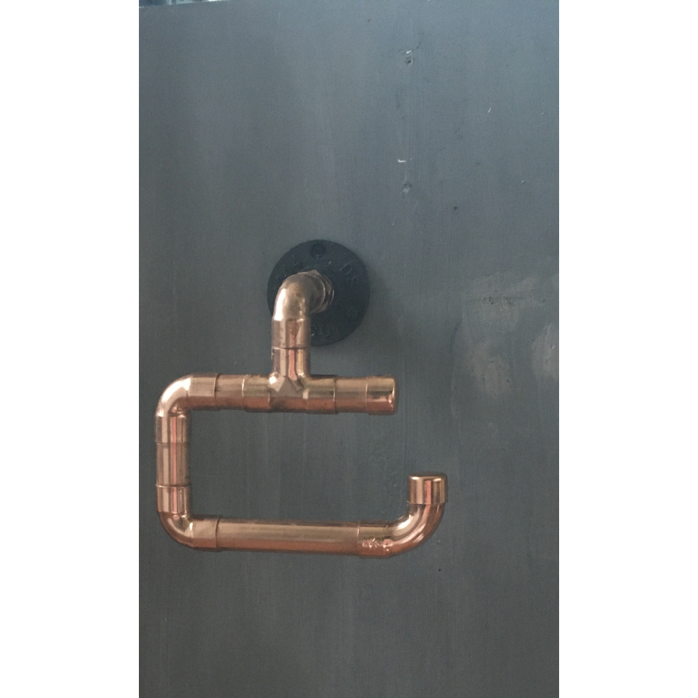 Deze toiletrolhouder is gemaakt van een dikke ( 22 mm!) koperen pijp en fittingen en zal geleidelijk oxideren in de tijd en zal donkerder worden wat er industrieler uitziet.